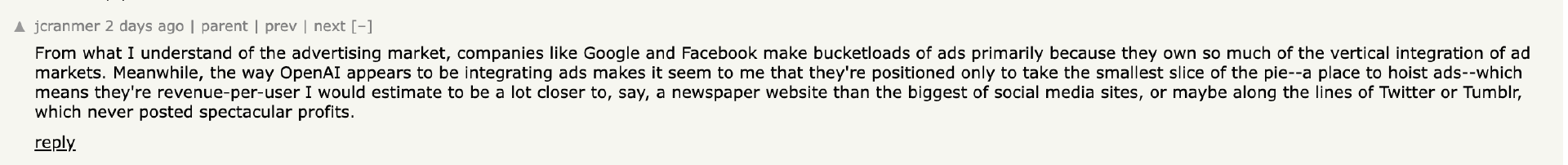 “就我所了解的广告市场而言,像谷歌和 Facebook 这样的公司之所以能赚得盆满钵满,主要是因为它们在广告市场的垂直整合中占据了绝对优势。而 OpenAI 整合广告的方式在我看来,似乎只是想分得蛋糕里最小的一块——一个投放广告的地方——这意味着,我估计他们的用户收入更接近于报纸网站,而不是最大的社交媒体网站,或者更接近于推特或 Tumblr 这类从未实现过巨额盈利的公司。”