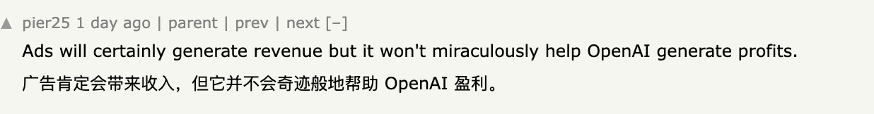 OpenAI 当然能从广告中赚到一些钱,但这能弥补他们巨额的亏损吗?我觉得不太可能。他们真的需要像微软那样,被一位财力雄厚的“金主”收购,才能玩转这种游戏。”