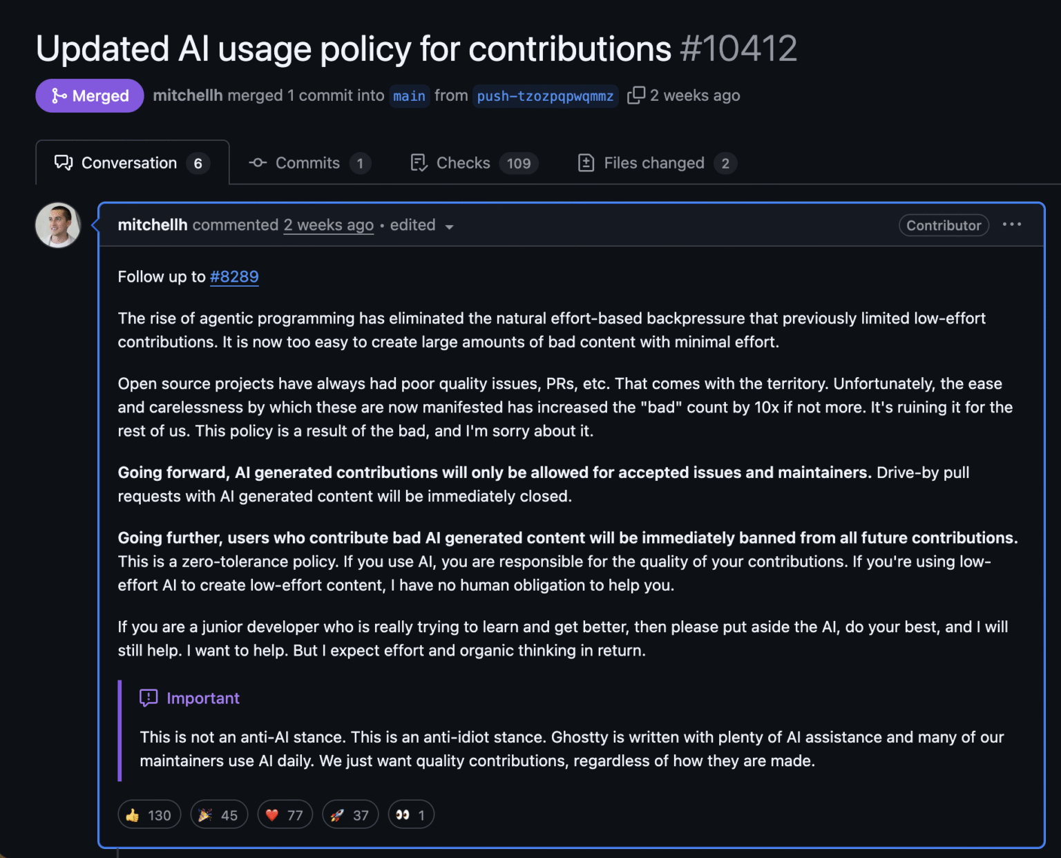 Hashimoto 对待 AI 贡献的方式也发生了变化。2025 年 8 月,他们开始要求强制披露。“如果你使用了**任何形式的 AI 辅助**来为 Ghostty 做贡献,就必须在拉取请求中进行说明。”但到 2026 年 1 月底,他采取了零容忍态度。AI 生成的贡献仅限于已经接受的问题和维护者。Hashimoto 澄清说: