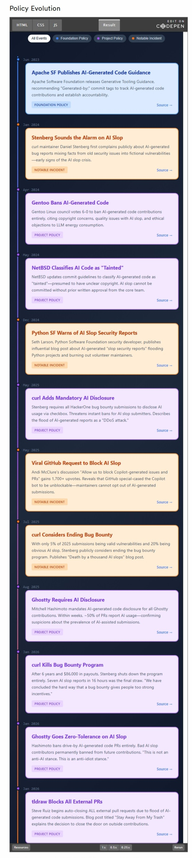 在这篇文章中,我将讨论 AI Slop 时代的开源现状,以及许多已经精疲力尽的维护者的应对方式。我研究了几个已经明确立场的项目,同时也关注了来自知名开源组织的具有代表性的生成式 AI 政策。最后,我提出了几点关于继续推进相关工作的总体建议。