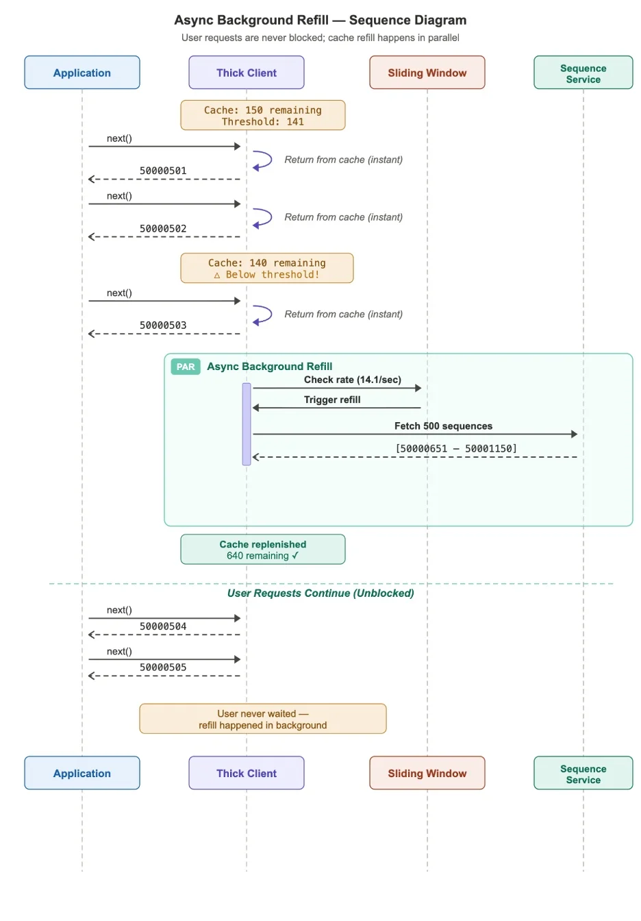 滑动窗口运行在厚客户端(一个直接嵌入到应用进程里的库)内部,不涉及独立进程或服务调用。客户端会跟踪自身的序列消费速率,并在本地缓存耗尽前决定何时向序列服务请求重填。