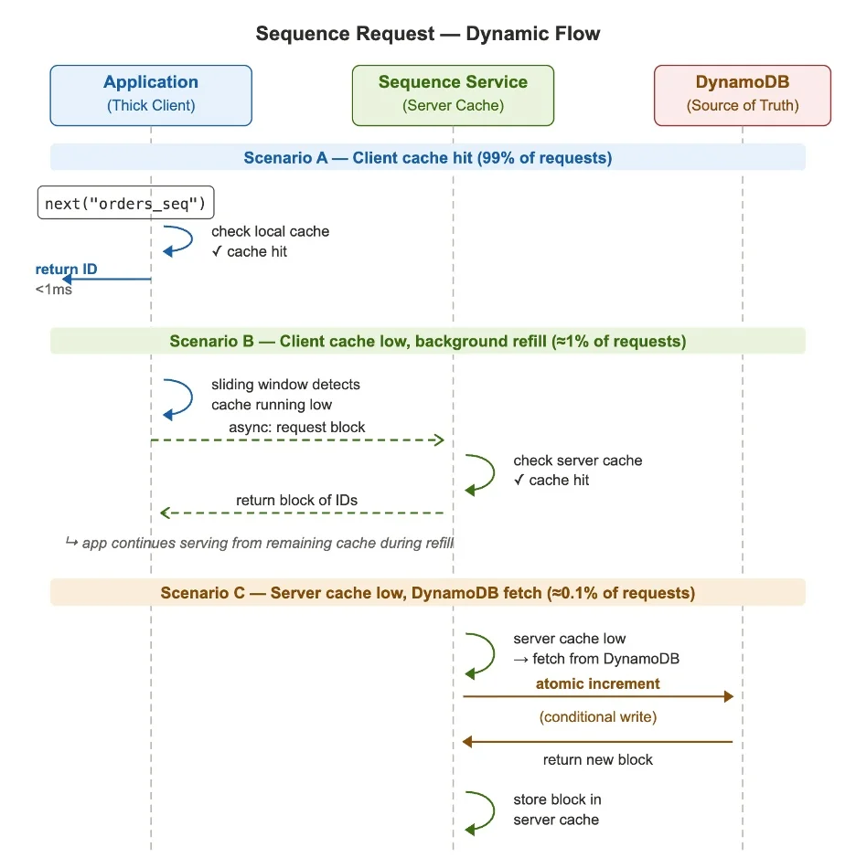 下图展示了客户端请求序列时各层的处理流程。具体分为三种场景,取决于请求在哪个层被处理:客户端缓存命中,请求全程不离开应用进程,客户端缓存不足时,由序列服务在后台进行补充,仅当两层缓存均耗尽时,才会触发 DynamoDB 查询。