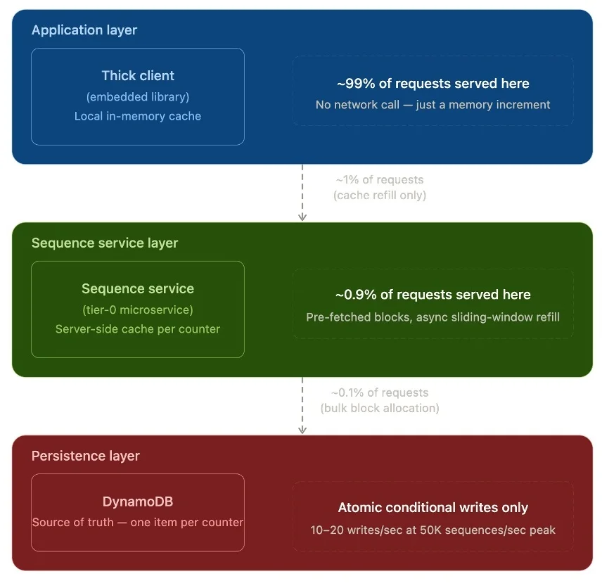 序列服务成了我们的 0 级(Tier-0)核心服务(这是我们内部对关键路径基础设施的叫法,这类服务一旦发生故障,会直接导致订单、支付等核心业务停摆)。多个一级(Tier-1)服务都依赖它生成主键。它整体分为三层:以 DynamoDB 作为可信数据源,上层是服务端缓存层,再上层则是带本地缓存的重量级客户端。