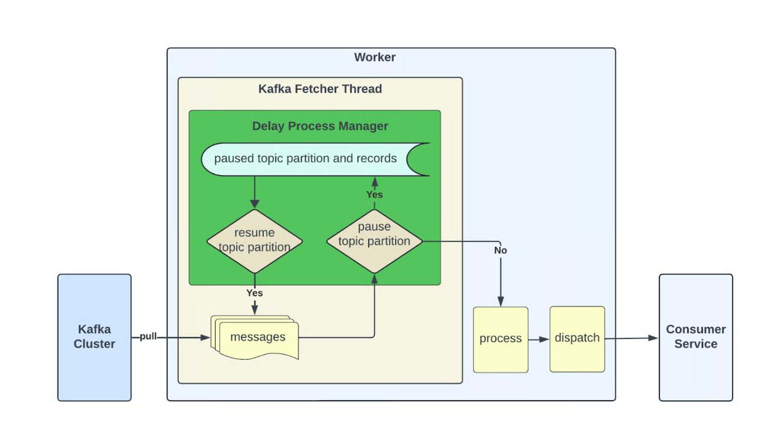 DelayProcessManager 支持分区级暂停与恢复控制,实现更细粒度的回压(backpressure)处理。当依赖不可用或被限流时,仅缓冲阻塞的分区,而非停止整个消费者;其他分区会继续正常处理,在保持吞吐、减少全局变慢的同时,简化服务内部的延迟处理逻辑。