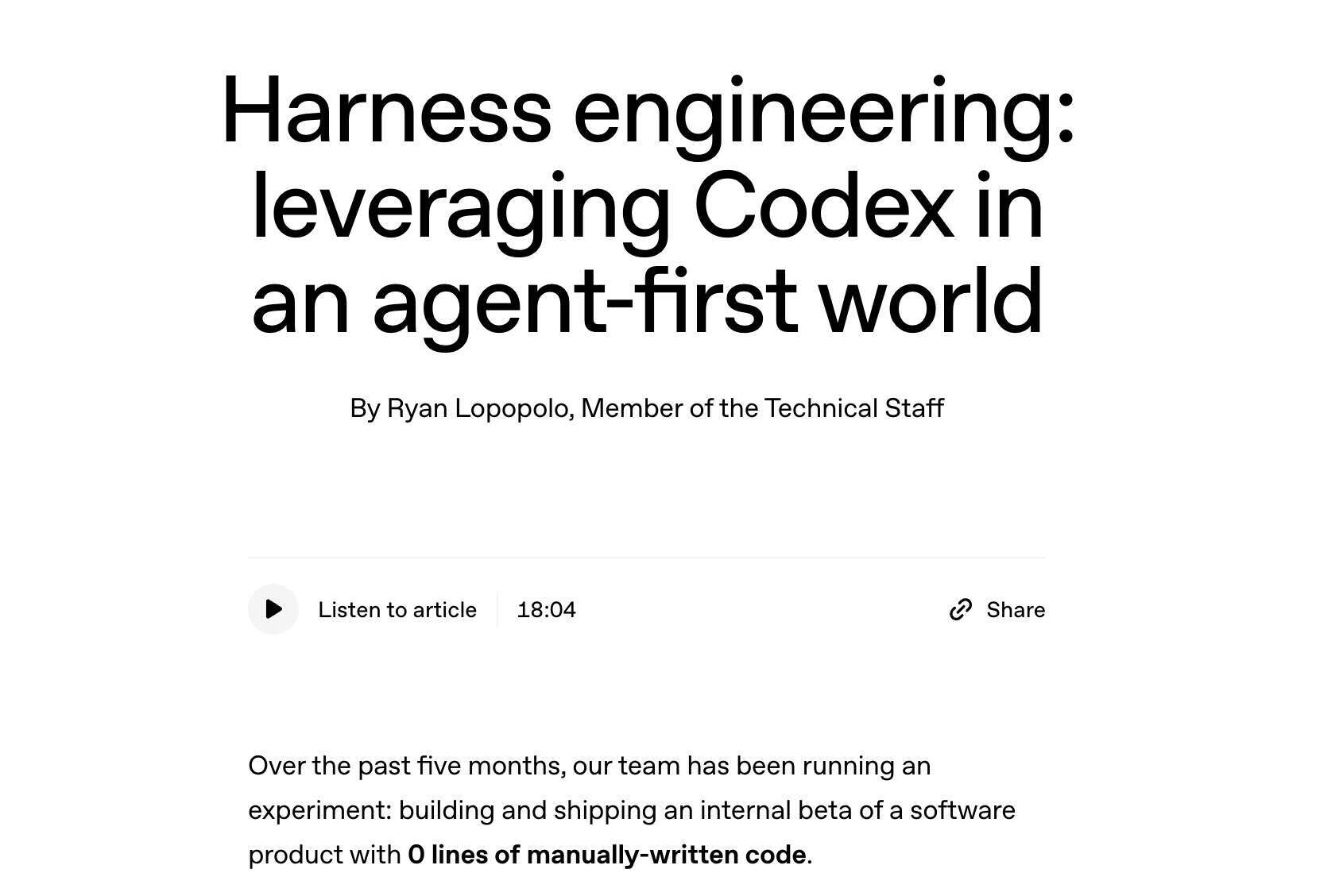 小编注:Sherwin Wu 提到的这次实验,OpenAI 已经写成博客公开了:https://openai.com/index/harness-engineering/。文章记录了一个“0 人手写代码”的软件工程实验:团队用 5 个月从空 Git 仓库起步,做出一个真实可用的内部产品——能上线部署、会出故障也会被修复,且已经被数百名内部用户使用(包括每天都在用的重度用户)。但从头到尾 没有任何人工直接写代码:应用逻辑、测试、CI 配置、文档、可观测性、内部工具,全部由 Codex(Codex CLI + GPT-5)生成。最终在仅 3 名工程师驱动下,累计合并约 1500 个 PR、产出接近 100 万行代码;他们估算整体交付速度约为传统手写的 1/10。