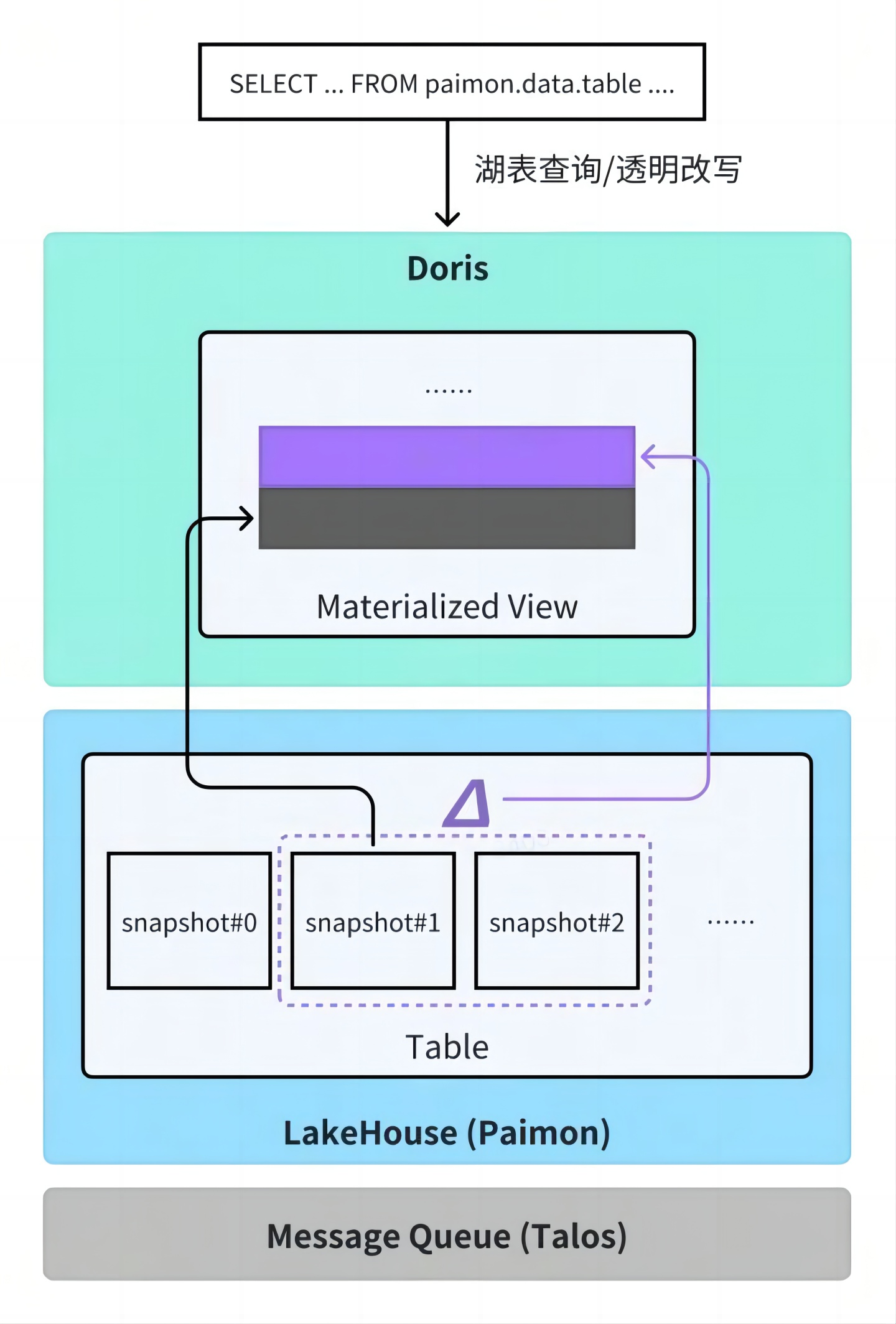 自 Doris 2.1 版本引入异步物化视图能力后,只需在 Doris 中声明物化视图定义,系统即可自动完成从外部数据湖(如 Iceberg)增量同步、数据聚合、更新调度等全过程,无需额外开发 ETL 链路,也无需关注底层执行细节,显著降低了开发与运维负担。同时,Doris 支持物化视图改写能力,用户仍可使用原有 SQL 查询原始表,系统会自动识别并将其透明改写为对应的物化视图,实现查询加速。目前该功能基于增量方式实现,主要支持仅追加场景,更新场景仍处于研发状态。