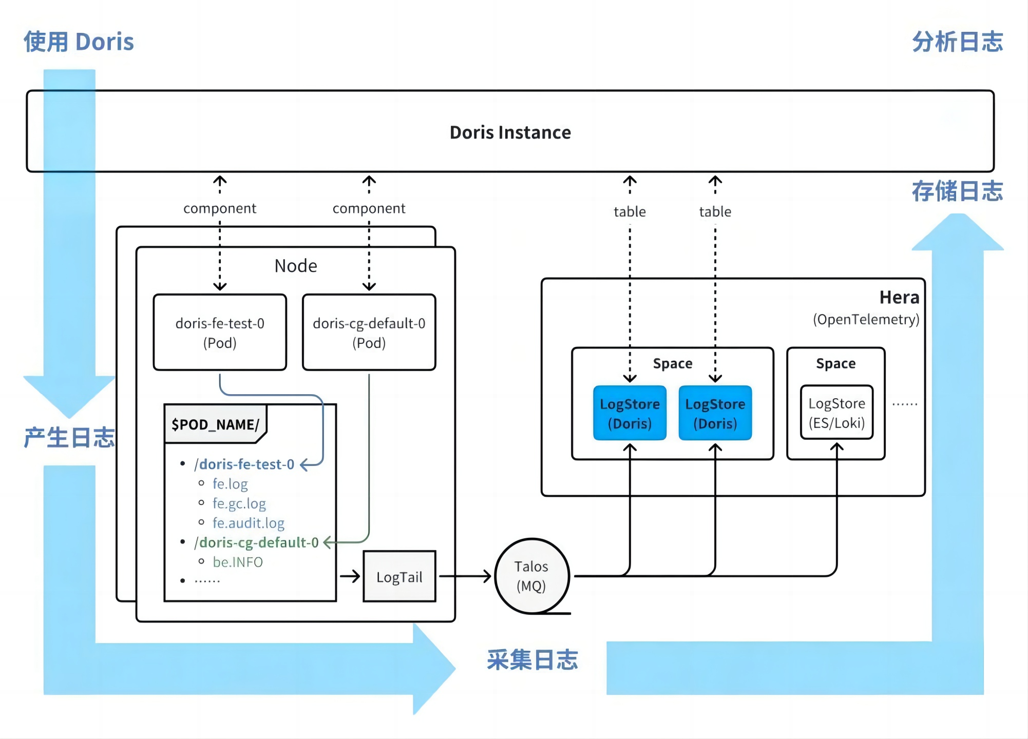 在日志采集方面,采用自研的 Hera(log tail 组件)实现高效采集,同时,借鉴社区的日志检索场景实践,将 Doris 作为 OpenTelemetry 的存储后端:Doris 自身运行产生的日志经采集后,最终回流并存储至 Doris 内部表中,形成“日志产生-采集-存储-查询”的闭环。