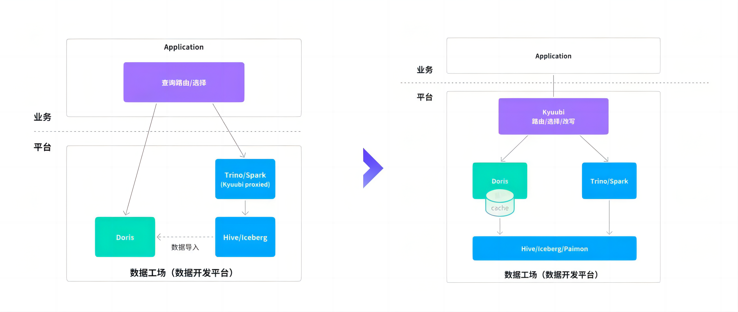 基于此,数据开发平台的整体架构发生变化:Doris 不再局限于传统“外仓”的角色,而是向上演进为统一的查询引擎层,与底层 Iceberg、Paimon 等湖仓格式解耦,直接进行联邦查询,同时利用自身的数据缓存、物化视图等能力对热点数据进行加速,兼顾灵活性与高性能。