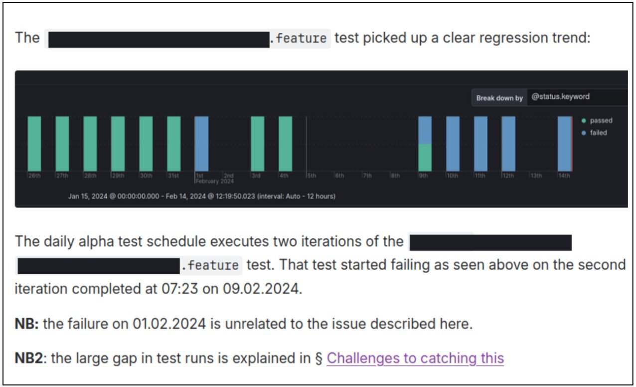 从这个视图可以看出,回归问题显而易见。自从采用这种方法以来,我们仅发现过一例:有一个隐蔽的缺陷,虽然已经在“故障视图”中被标记,并且经多人审查,但最终还是逐渐恶化,变成了客户缺陷。该缺陷极其隐蔽,即便已在“故障视图”中被如实标记,而且有多个人查看了屏幕截图和日志文件,却还是被遗漏了。但上述方法的关键优势在于,即便在极少数失效的情况下,我们也能完整记录“故障”状态的演变过程,从而可以在事后分析中对每日已知情况进行全面的追溯。以下是该漏洞最终混入已发布软件的报告,从中可以看到这一点: