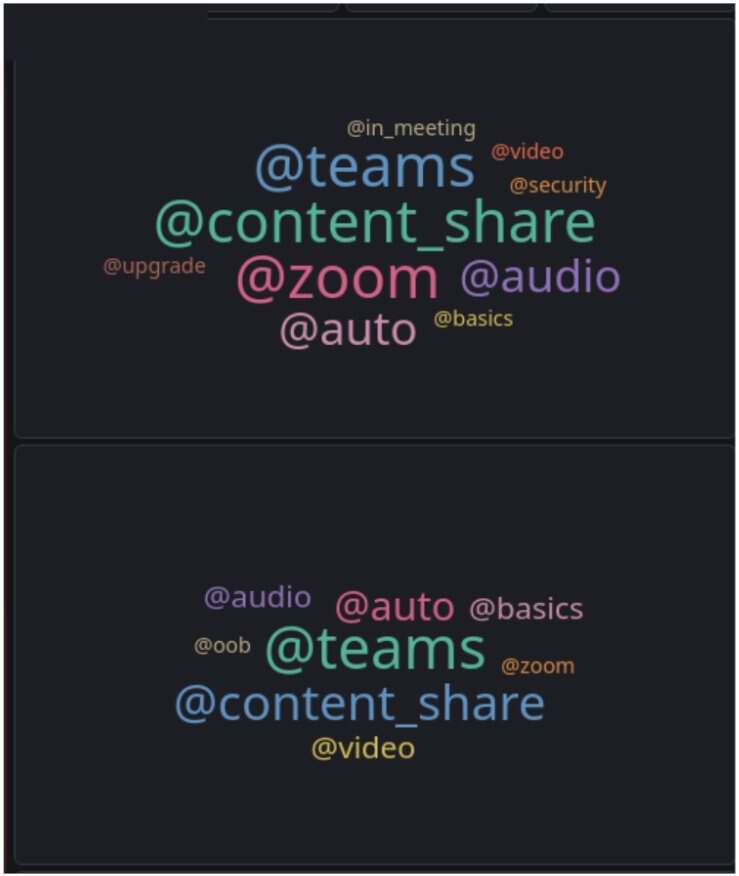 对于这种情况,我们可以使用配对可视化。举例来说,对于昨晚失败的测试和前晚失败的测试,我们可以分别把它们的顶级功能域标签做成标签云,并将两者进行比较。标签云中每个标签的相对大小代表其比例,反映了各功能领域中测试失败的数量: