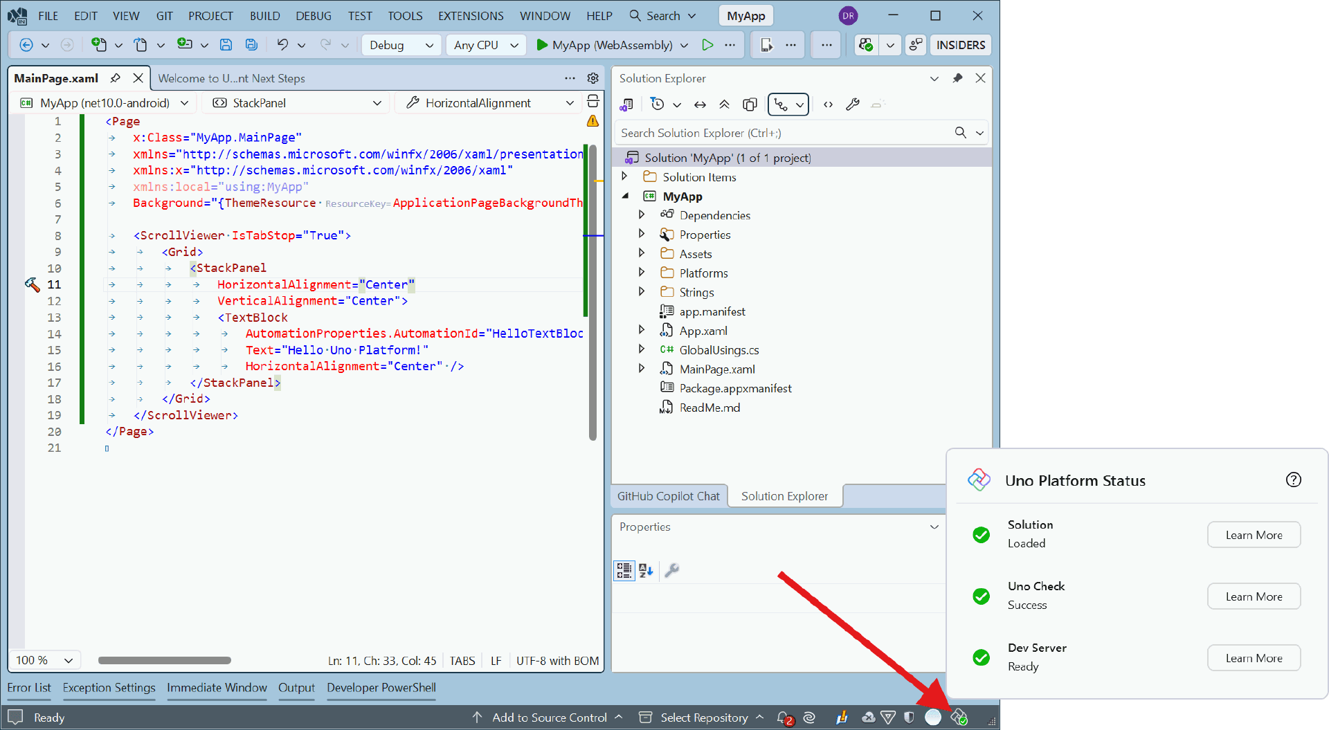 Visual Studio 中全新的 Uno Platform 状态面板