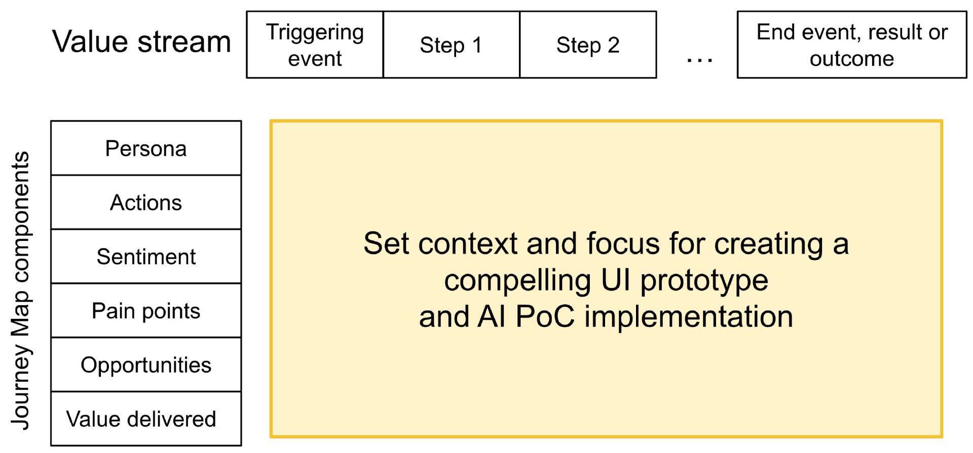 因此,首次研讨会聚焦于使用简洁布局定义用户旅程图(如下图),以价值流图为背景(触发事件 → 步骤 1 → 步骤 2 … → 步骤 6 → 结束事件/结果),并按故事板划分泳道(角色、行动、情绪、痛点、机会、交付价值)。