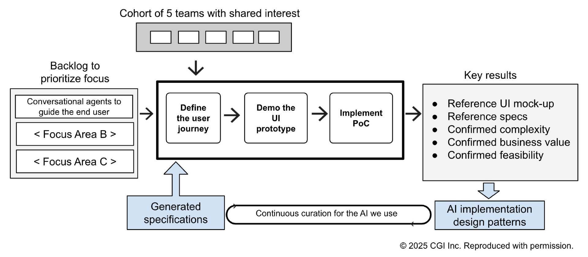 根据每期队列的战略主题,邀请团队成员。在首次研讨会中,队列成员深入探讨所选用户故事并定义用户旅程。随着时间推移,队列逐渐转向通过自然对话描述上下文,而非提交结构化输入,用户故事演变为由业务负责人讲述简短故事后自动生成。贯穿队列过程的一项关键考量是,在有限时间内平衡交付引人注目的成果与保持专注性。