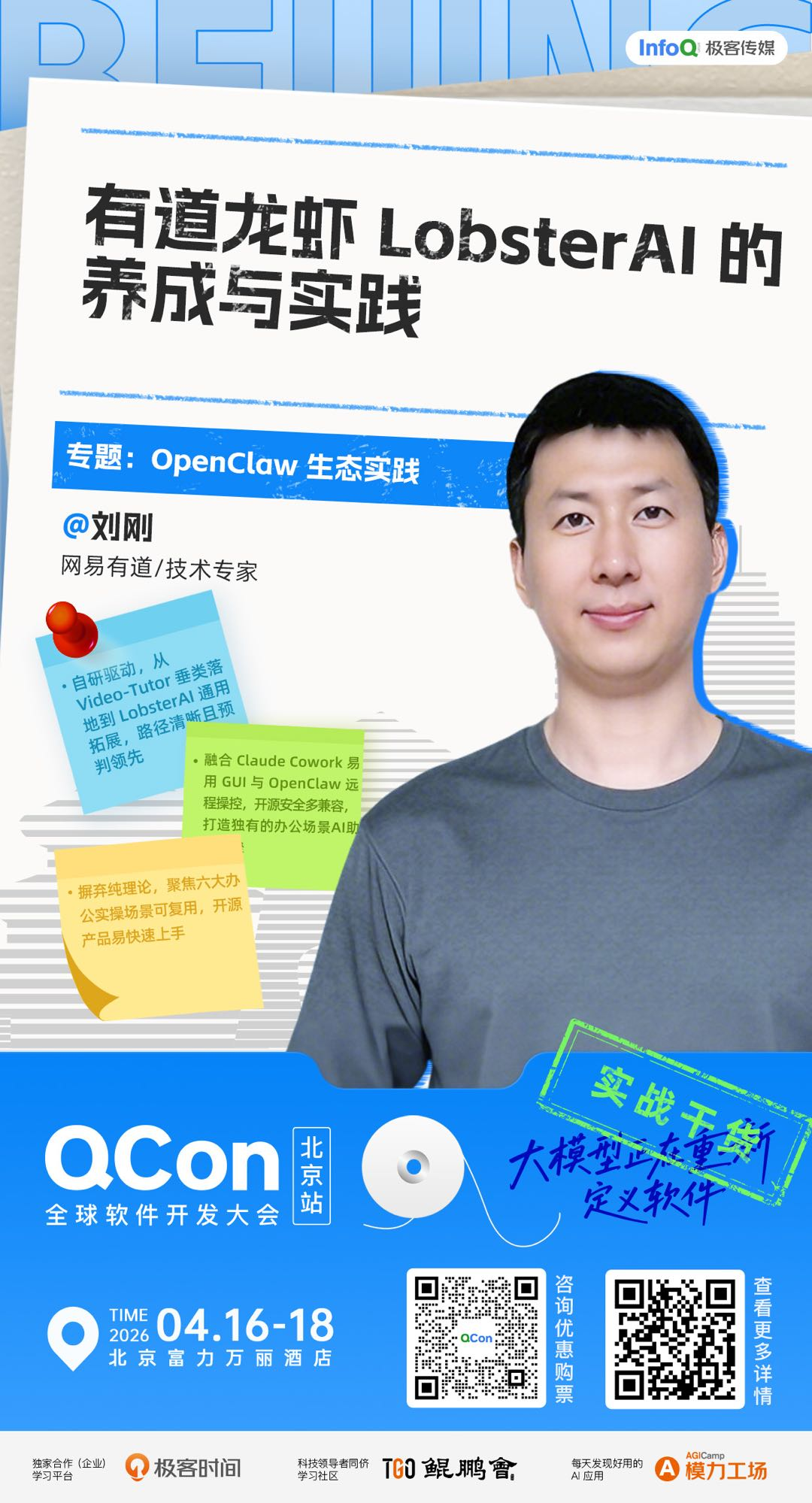 网易有道技术专家刘刚已确认出席 “OpenClaw 生态实践” 专题,并发表题为《有道龙虾 LobsterAI 的养成与实践》的主题分享。本次分享将介绍网易有道 LobsterAI 的研发历程与产品实践。团队先推出教育垂类 Agent Video-Tutor 并落地为答疑笔核心功能,后基于 Agent 工程化积累,瞄准非技术人员办公需求,依托 Claude Agent SDK 打造通用原型,早于行业预判 Skills 体系、定时任务、手机远程控制三大方向,OpenClaw 走红验证思路后正式推出 LobsterAI 并开源,一周获 GitHub 超 3k 星。