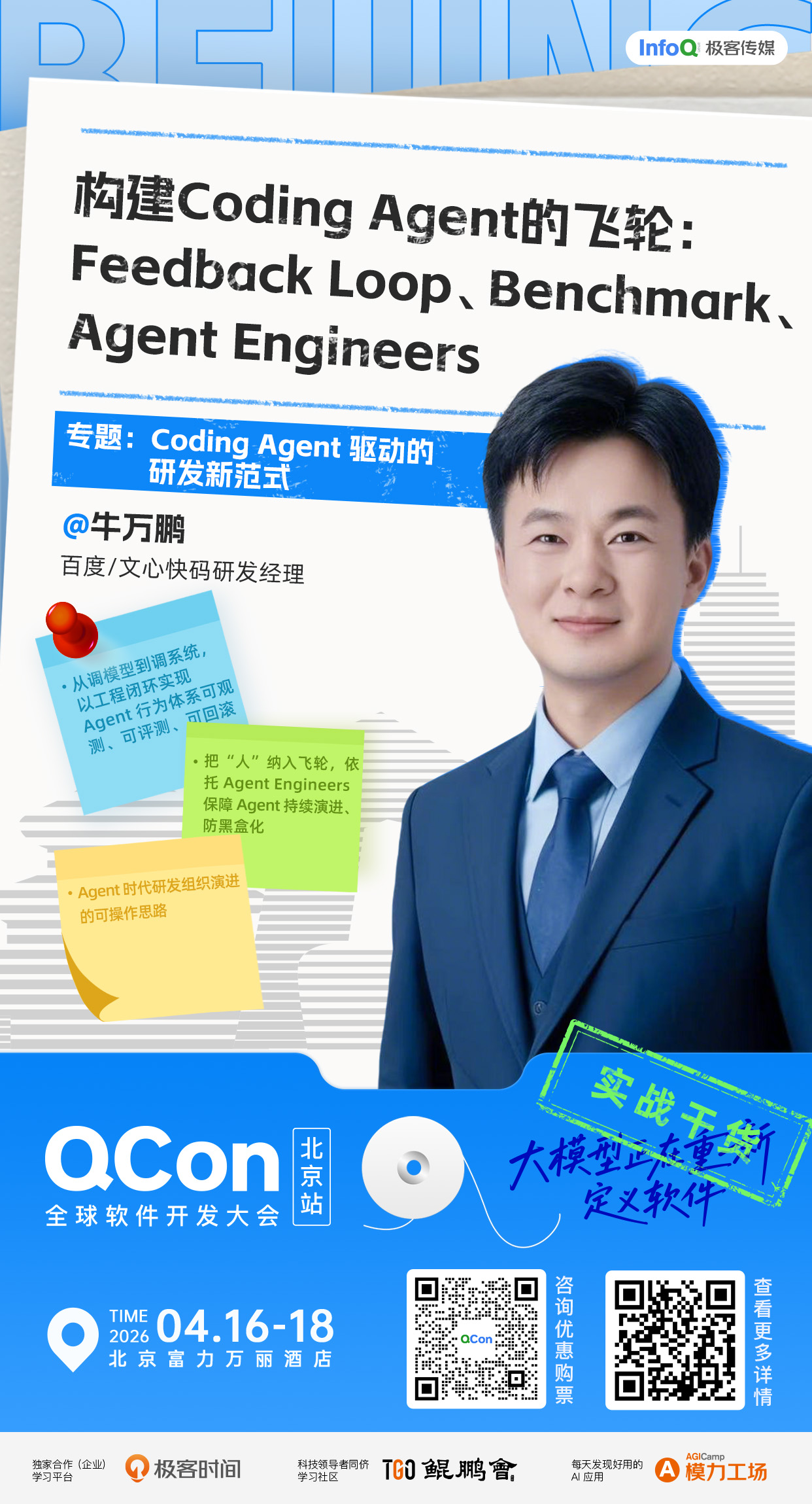 4 月 16 日-4 月 18 日,QCon 全球软件开发大会将在北京举办。本届大会锚定 Agentic AI 时代的软件工程重塑,聚焦 Agentic AI、多智能体协作、算力优化、技术债治理、多模态和 AI 原生基础设施等前沿话题,邀请来自腾讯、阿里、百度、华为、蚂蚁、小米、网易等企业技术专家,带来百余项真实落地案例,系统性分享前沿洞察与实战干货,以技术共创探索 AI 落地新路径。