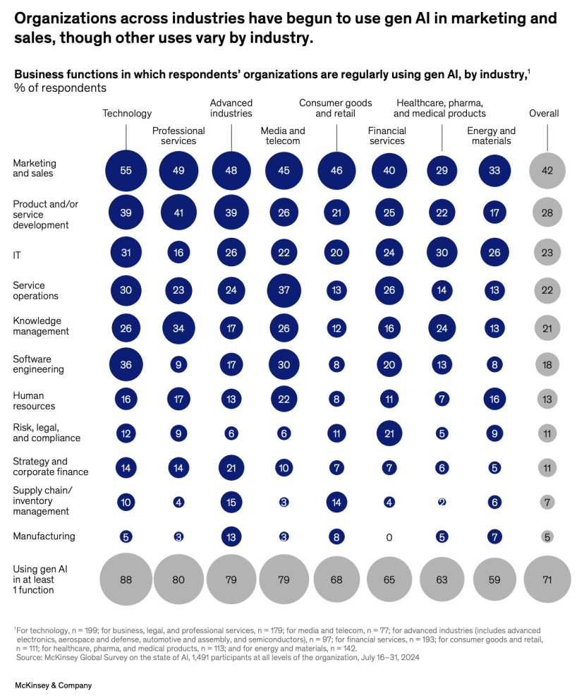 图源:麦肯锡《The State of AI 2025》,展现了各行业中,“营销与销售”都是最普遍使用 GenAI 的职能。