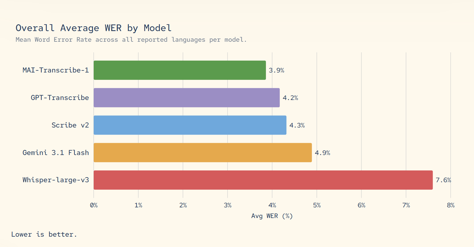 该模型采用基于 Transformer 的文本解码器与双向音频编码器,支持 MP3、WAV、FLAC 格式文件,最大容量 200MB。微软表示,其批量转写速度是现有 Azure Fast 服务的 2.5 倍。在行业标准多语言测试基准 FLEURS 上,该模型针对微软产品使用量最高的 25 种语言,实现了最低的平均词错误率,仅为 3.8%。微软已在 Copilot 语音模式和 Microsoft Teams 中测试 MAI-Transcribe-1 用于对话转写,这一细节也凸显出该公司正计划迅速用自研模型替代第三方或旧版内部模型。