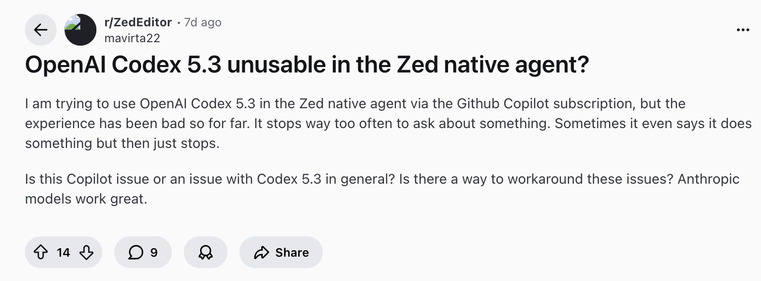 另一些用户反映新模型在某些编辑器里表现尚不成熟,例如在 Zed 编辑器中体验不佳,偶尔中断或无法按预期编辑文件,甚至有人因此重新回退使用老版本。