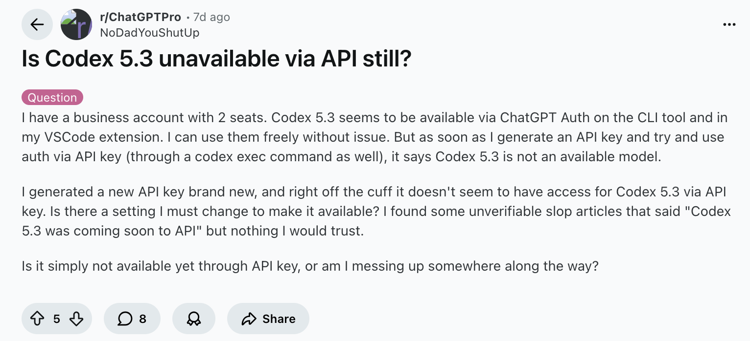 但也有不小比例的用户发出了批评:有用户指出目前 GPT-5.3-Codex 尚未通过 API 向所有开发者开放,部分平台(如通过 API key)无法直接调用最新模型,这让许多开发者难以在自定义环境中集成。