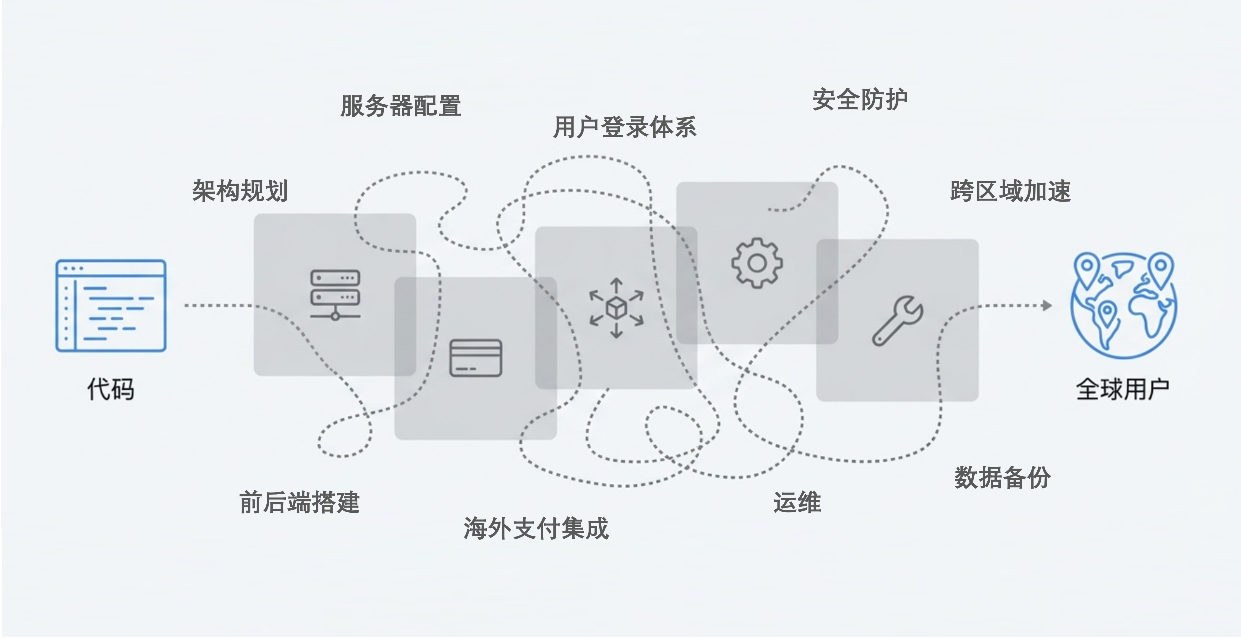 过去,Web 项目出海面临“部署周期长、上线速度慢”的问题。以 AI 工具为例,许多团队选择将产品以 SaaS 模式推向海外市场以寻求增长,然而,海外部署涉及架构规划、服务器采购与配置、前后端搭建、用户登录体系(邮箱验证、第三方登录等)接入、海外支付(多币种与回调处理)集成、运维、备份、跨区域加速等复杂环节,项目上线往往耗费数周。