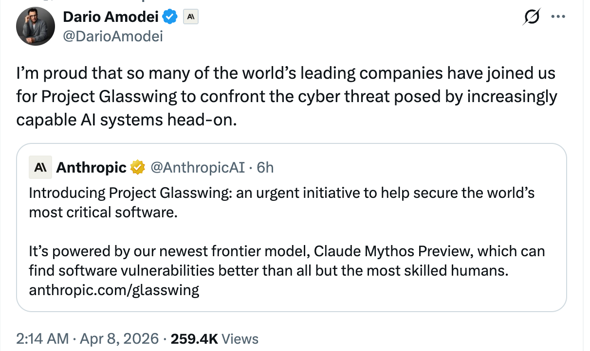 Anthropic CEO Dario Amodei 发推称,“我很自豪,全球这么多顶尖公司加入了我们的 Glasswing 计划,一起正面应对能力不断增强的 AI 系统所带来的网络安全威胁。”
