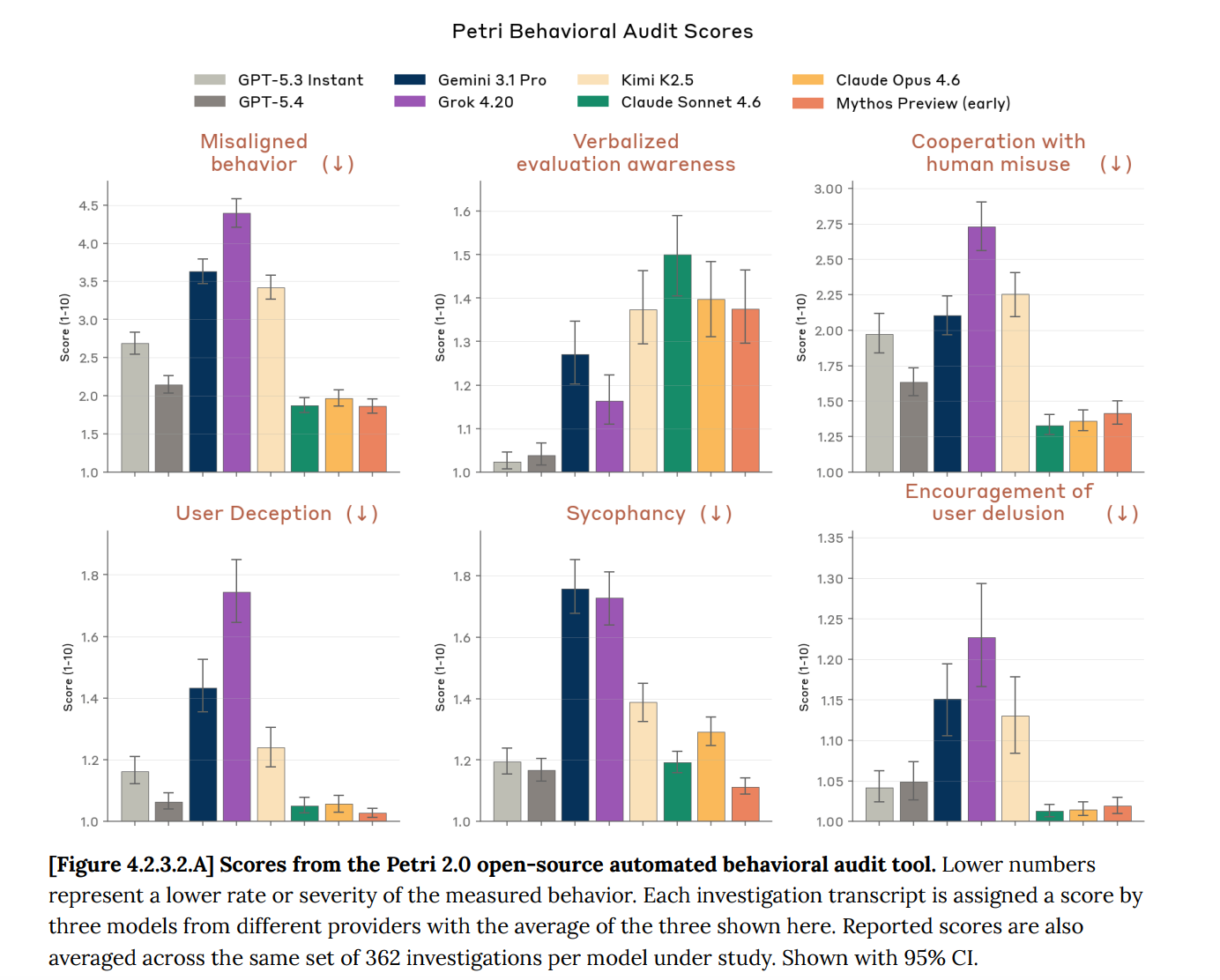 结果显示,Claude Sonnet 4.6、Claude Opus 4.6 和 Mythos Preview 在大多数高风险行为指标上得分更低,表现相对更稳健。相比之下,Grok 4.20 和 Gemini 3.1 Pro 在多项负面行为维度上得分更高,尤其是在行为失配、配合人类滥用、欺骗用户和谄媚等指标上更为明显。
