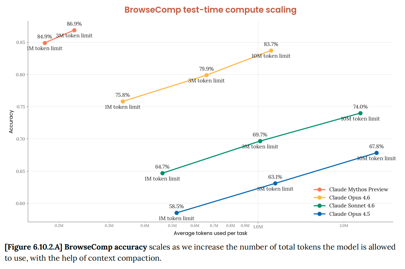 在启用网页搜索、网页抓取、工具调用和代码执行后,Claude Mythos Preview 在一项高难度基准测试中取得 86.9% 的成绩,高于 Claude Opus 4.6 的 83.7%。不过,官方判断这项测试已接近“饱和”,因此分数提升本身并不算特别大。