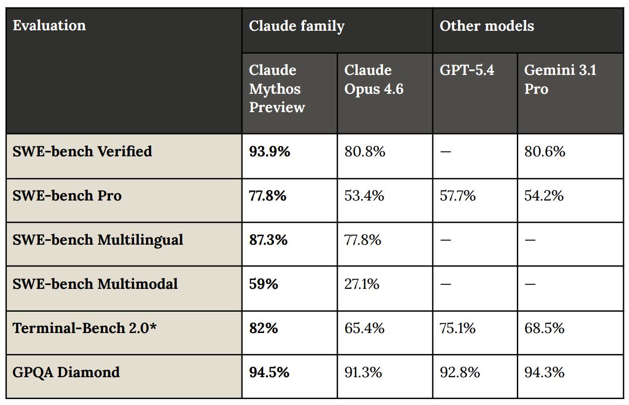 根据内部测试,Claude Mythos Preview 在代码、安全和复杂推理等多项基准测试中整体领先。其在 SWE-bench Verified、SWE-bench Pro、Terminal-Bench 2.0、GPQA Diamond 等测试中,成绩均高于 Claude Opus 4.6,并在多项指标上超过 GPT-5.4 和 Gemini 3.1 Pro。