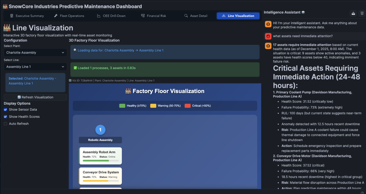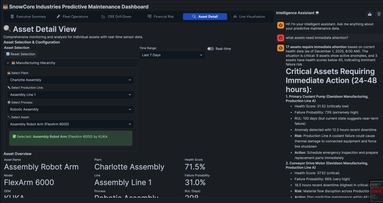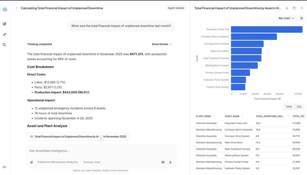 统一语境:如侧边栏所示,该智能体能够访问一个综合语义视图,该视图融合了维护工单类型(预防性、预测性、紧急)、活动数据(停机时长、人工成本)以及规划输入(健康评分、剩余使用寿命 RUL)。这使其能够回答需要交叉参考实时传感器数据、历史维护日志及财务限制条件的复杂问题。