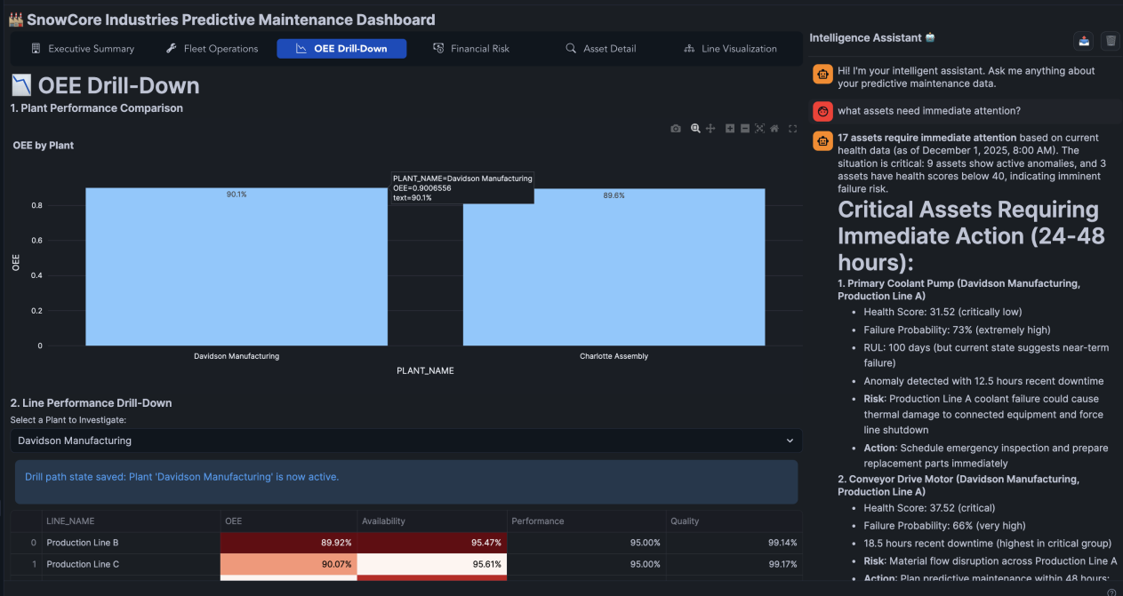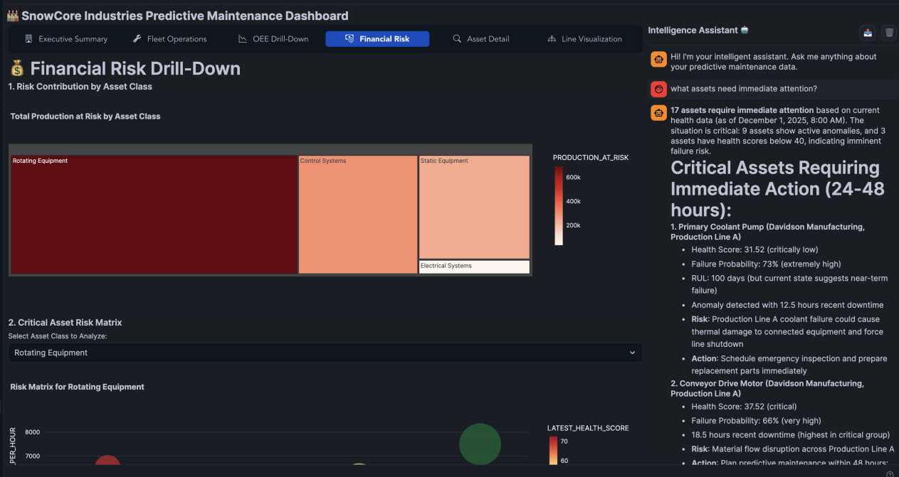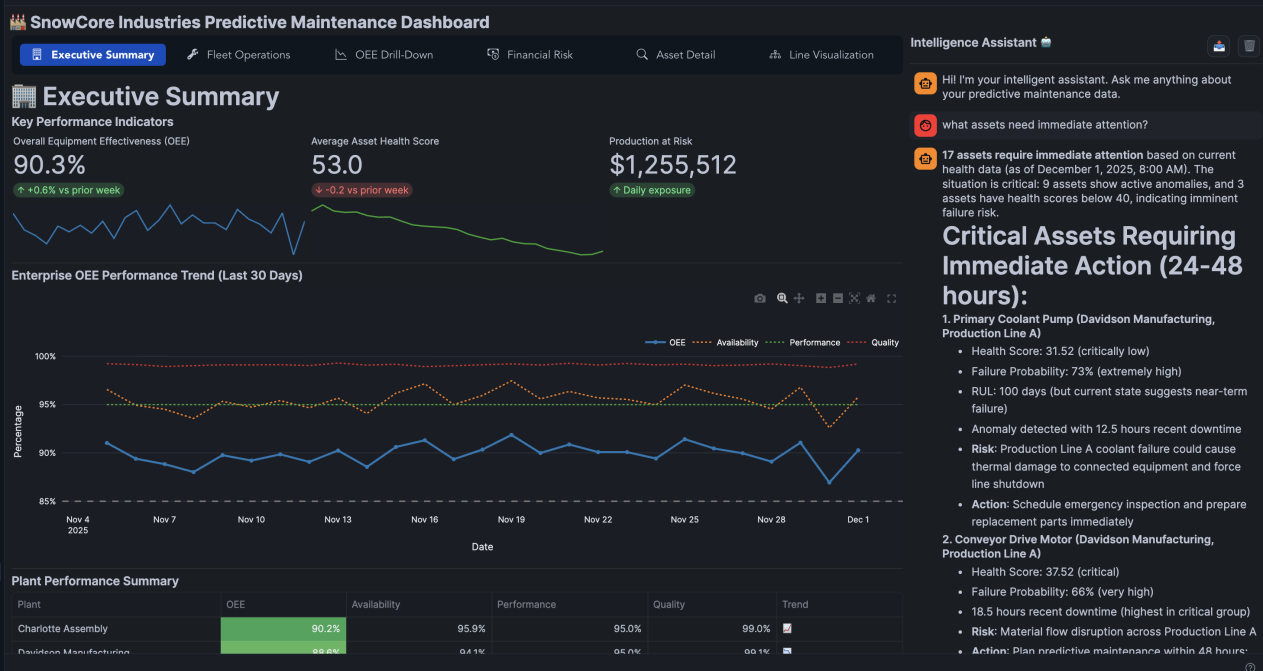 智能助理:永远在线的专家(显示在所有截图的右侧边栏)。该嵌入式 AI 智能体贯穿应用的每一个页面,始终陪伴用户左右,充当按需响应的领域专家。它由 Snowflake Intelligence 提供技术支持,使用户能够通过自然语言与自身数据进行交互。