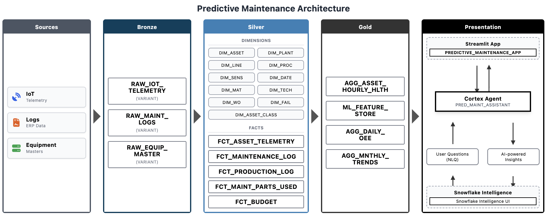 该解决方案整合了多源异构数据,具体包括:由物联网传感器采集的高速遥测数据(涵盖振动、温度及压力参数),以及来自维护记录、工单系统和设备主数据规范的事务性数据。原始数据经由基于 Snowflake 平台构建的“湖屋”三层架构进行加工处理,最终形成面向展示的统一数据层,为 Streamlit 应用程序及 Snowflake Intelligence 功能提供数据支撑。