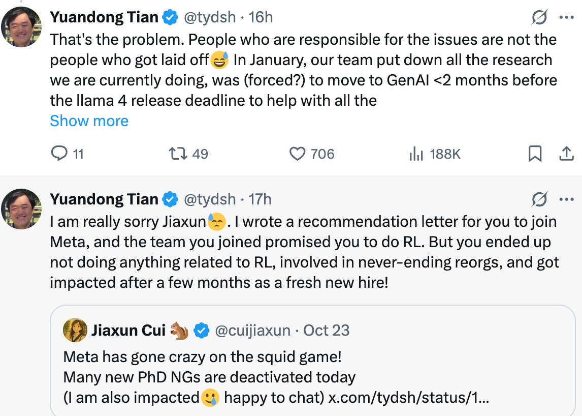 有人说这次裁员是为 Llama4 的失败负责。对此,田渊栋指出,“这就是问题所在。那些真正该为问题负责的人并不是被裁掉的那批人。今年一月,我们团队被要求放下手头所有正在进行的研究工作,被(强制?)调去支援 GenAI 项目,当时距离 Llama 4 发布截止日期不到两个月。我们负责处理各种后训练的杂活,在发布后还发现并修复了大量问题,结果最后被裁掉的却是我们。”