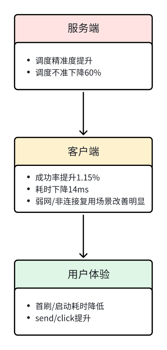 本方案通过服务端精准调度 → 客户端性能优化 → 用户行为改善的闭环,实现了全链路效能提升,既保证了调度精度,也优化了客户端访问体验和用户活跃度。