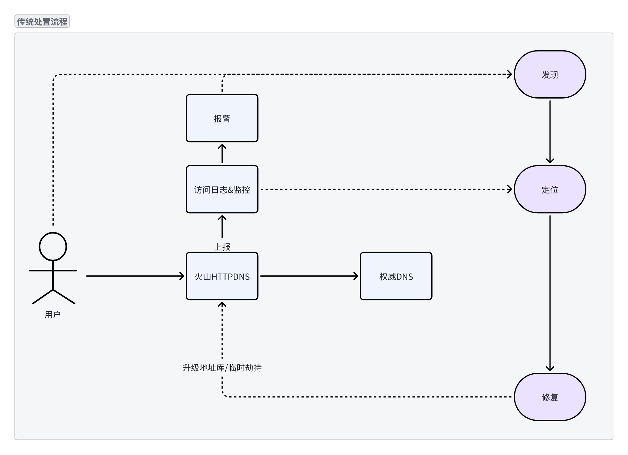 针对 HTTPDNS 调度不准风险,业界主流处置流程采用 “发现 - 定位 - 修复” 三步式闭环机制,具体如下: