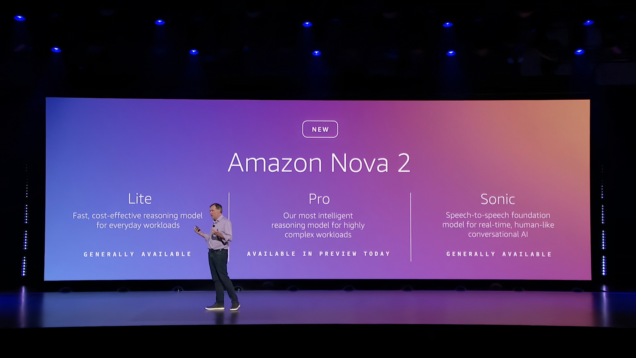 模型层面,相比去年 Andy Jassy 半小时的专门发布,今年简洁了许多。这次亮相的 Amazon Nova 2 系列模型包括 4 款:Lite、Pro、Sonic 和 Omni。