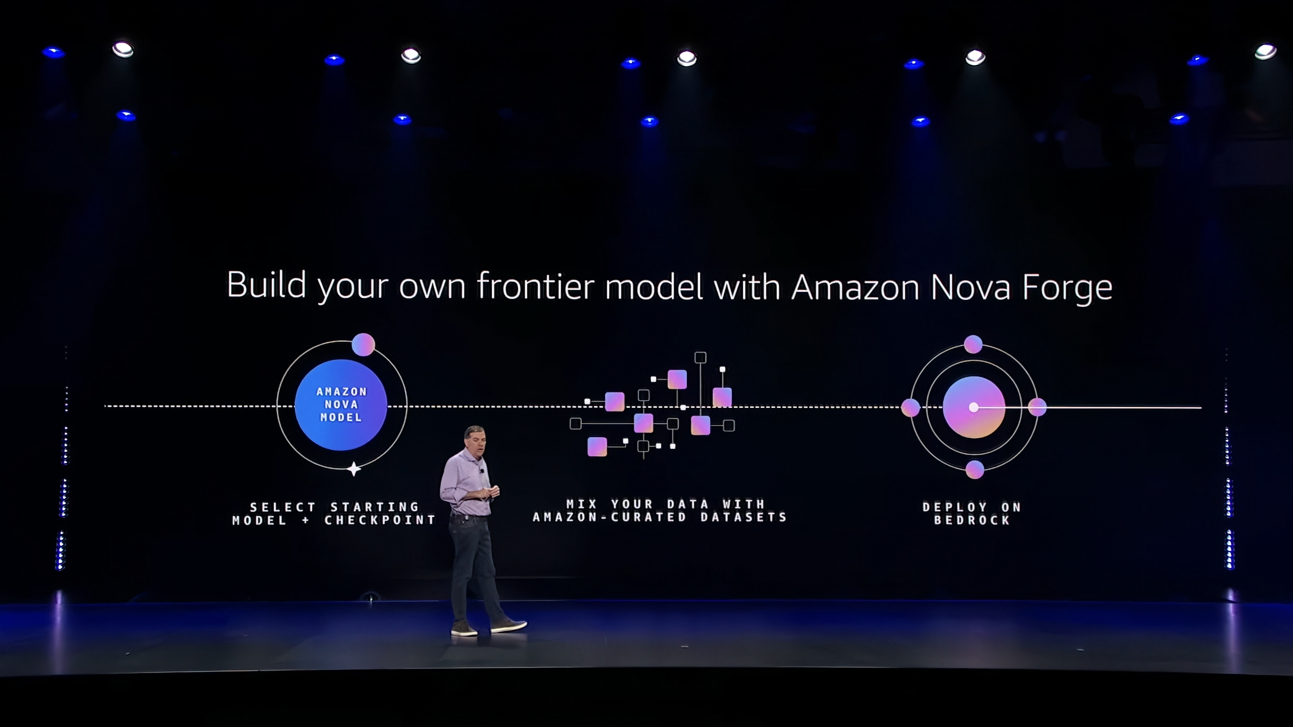 亚马逊云科技给出了预训练和微调以外的第三条路——Amazon Nova Forge。Amazon Nova Forge 首次引入“开放训练模型”(Open Training)理念,通过向企业开放 Amazon Nova 预训练、中期训练和后期训练阶段的模型检查点,以便企业可以在训练各阶段将自有数据与 Amazon Nova 精选数据集进行混合,从而打造既结合了 Amazon Nova 完整知识与推理能力,又深刻理解企业业务语境的定制模型。