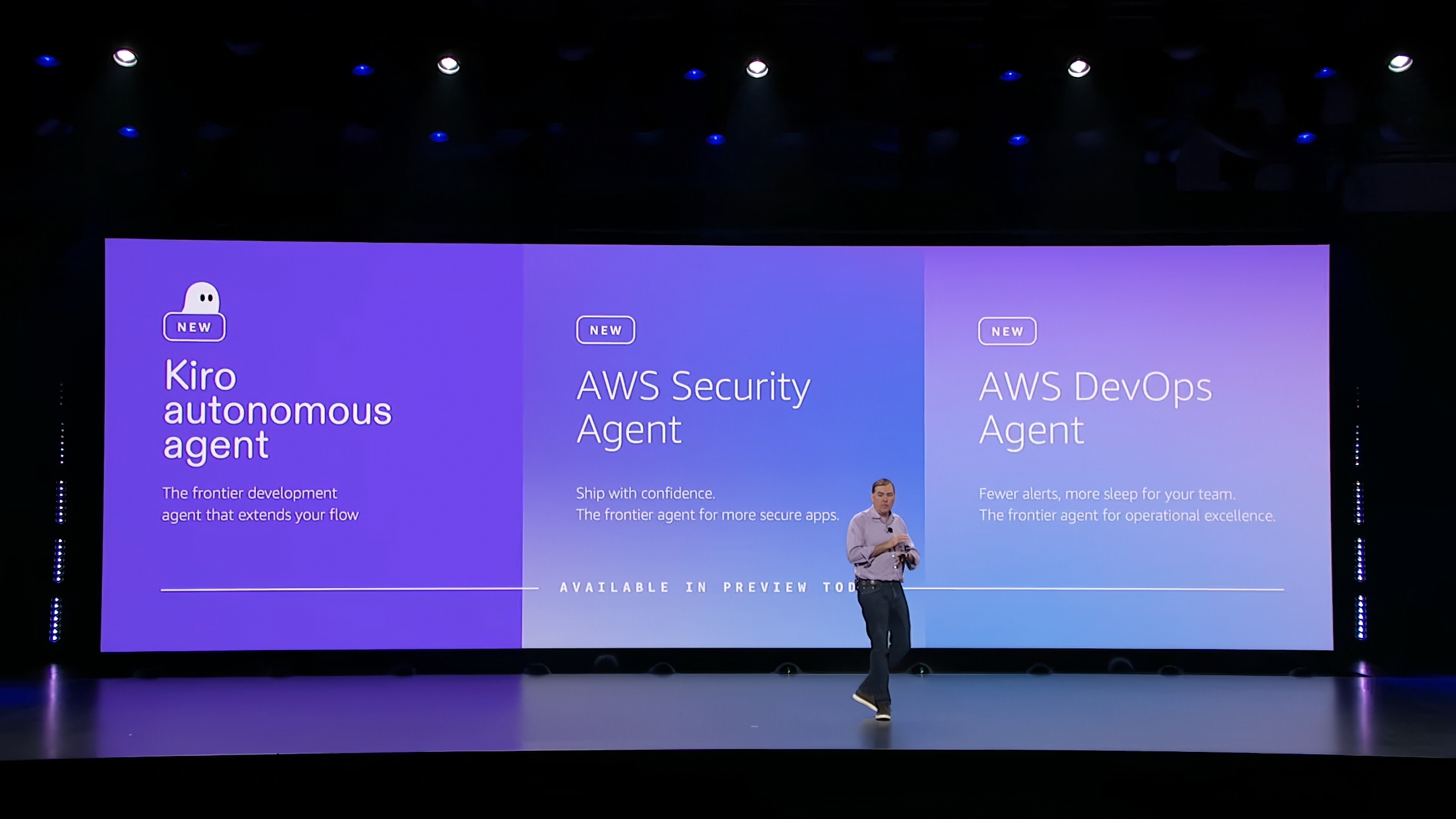 纵观整场 Keynote,一个标志着时代变化的信号就是,以前云厂商都是发布实例和云服务,从今年开始变成了发布 Agent。作为 Agentic AI 的头部玩家,亚马逊云科技这次一出手就是三个 Frontier Agent,并且都是能够革新开发体验的 Agent:Kiro Autonomous Agent、Amazon Security Agent 以及 Amazon DevOps Agent。
