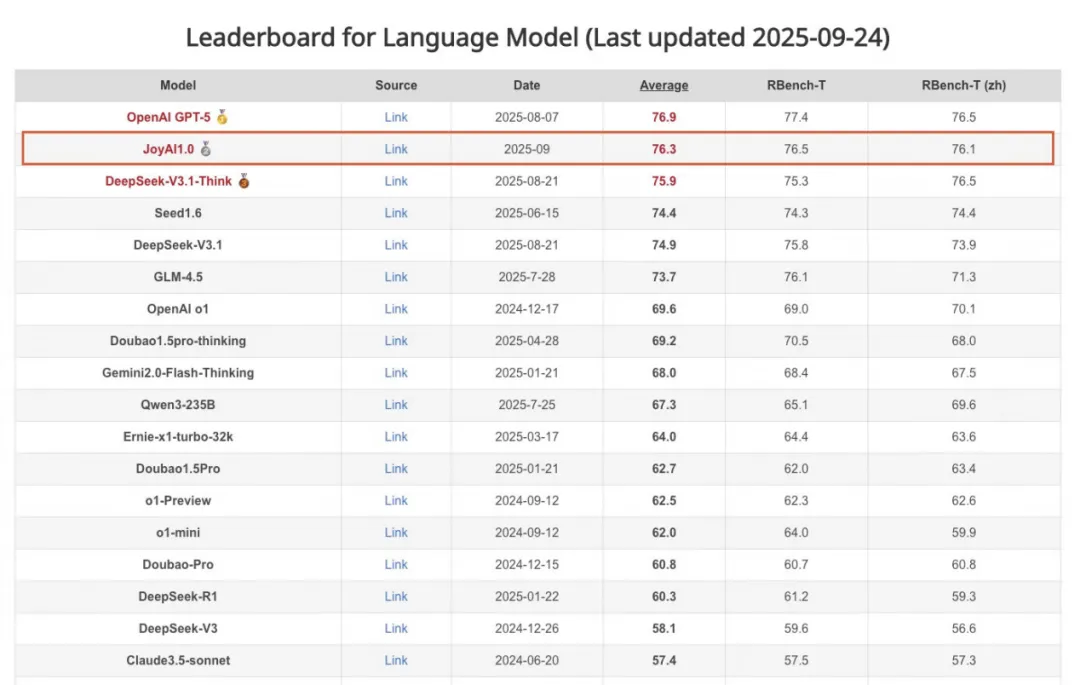 “他她它”一系列的能力离不开背后使用的 Joy AI 大模型,根据最新权威榜单 Rbench0924 评测,推理能力国内第一。据介绍,JoyAI 大模型涵盖从 3B 到 750B 的全尺寸模型,此外还有语音大模型 JoyAI LiveTTS 和数字人大模型 JoyAI LiveHuman。