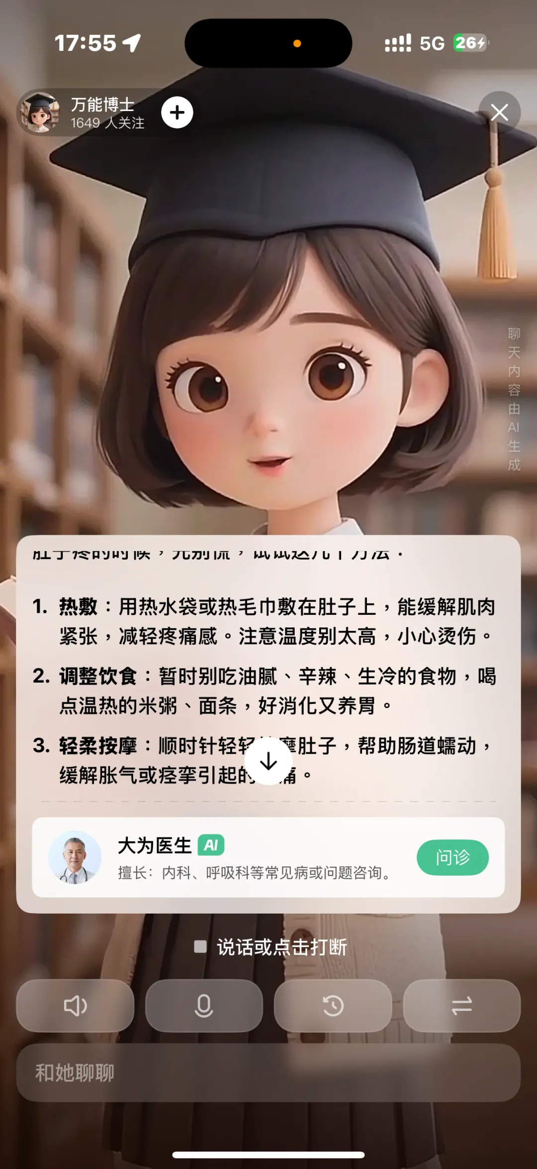 而当再与万能博士对话时,她还记得笔者肚子疼的事儿,有点小惊喜。