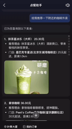 点外卖功能的体验同样流畅。当向万能博士表达点餐意图后,它会推荐“点餐助手”智能体,基于位置信息推荐附近餐厅,说明推荐理由、价格和距离。当笔者选择困难时,就让“点餐助手”帮忙选一个,它果断地照顾了打工人的钱包,选择了相对有性价比的瑞幸。测试中,它甚至自动领取了优惠券,体现出京东生态的整合优势。