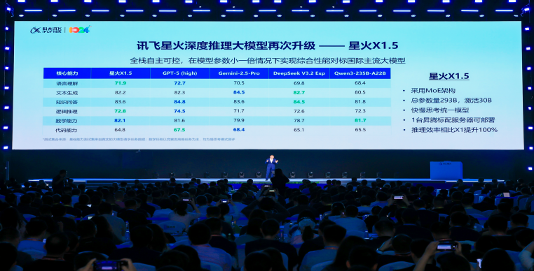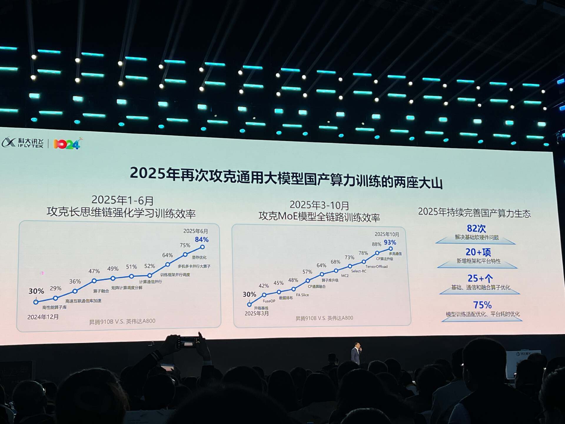 在自主可控方面,自 2023 年起,科大讯飞在合肥启动建设中国首个万卡国产算力平台,联合华为等团队,深耕底层算法创新,解决算力优化、平台适配等问题,如今适配率已达 84%。与此同时,过去七个多月,科大讯飞攻克 MoE 模型全链路训练效率,其对国外技术的替代率从今年 3 月的 30%提升至 93%。