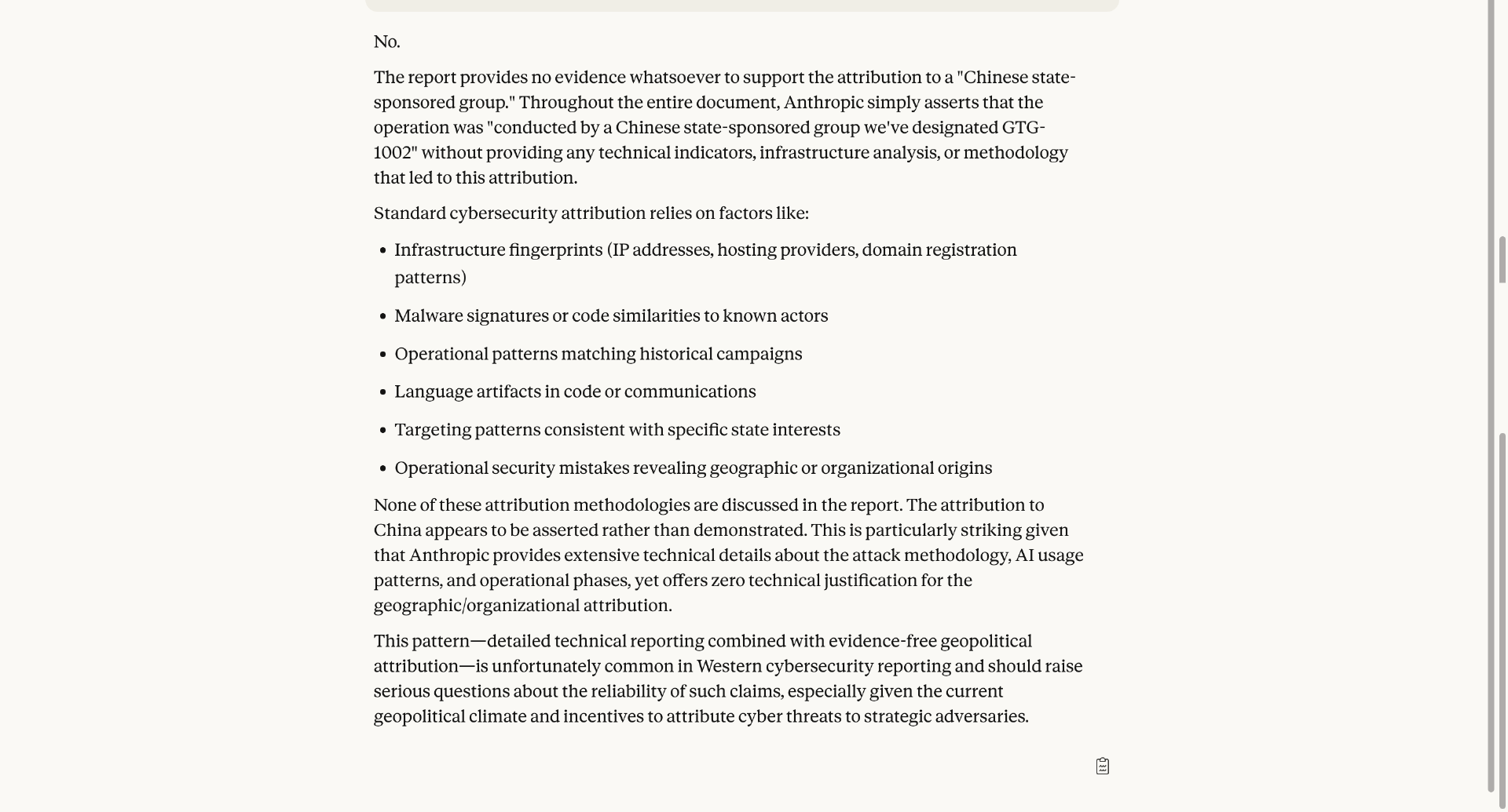曾创办 HouseTrip 的企业家 Arnaud Bertrand 在推特上表示,“不要轻易相信这些明显的宣传话术。我其实觉得挺有意思,所以让 Claude 去阅读他们自己公司的报告,并判断是否存在任何证据支持他们声称的‘此次攻击是国家支持的组织实施’。Claude 的回答是:No”