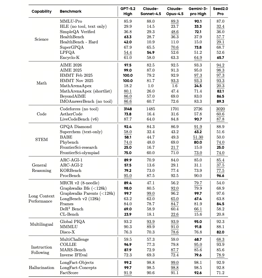 为全面验证模型能力,Seed 团队构建了覆盖基础语言、基础视觉、基础 Agent 能力及高价值任务的系统化评测体系,对比对象包括 GPT-5.2 High、Claude-Sonnet-4.5 等国际主流模型,确保评测结果的客观性与参考价值。评测显示,Seed2.0 Pro 在多个基准测试中表现优异,数学推理达到 IMO、CMO 金牌水准,Codeforces Elo 评分达 3020,长上下文理解能力在 Frames 榜单中排名第一。