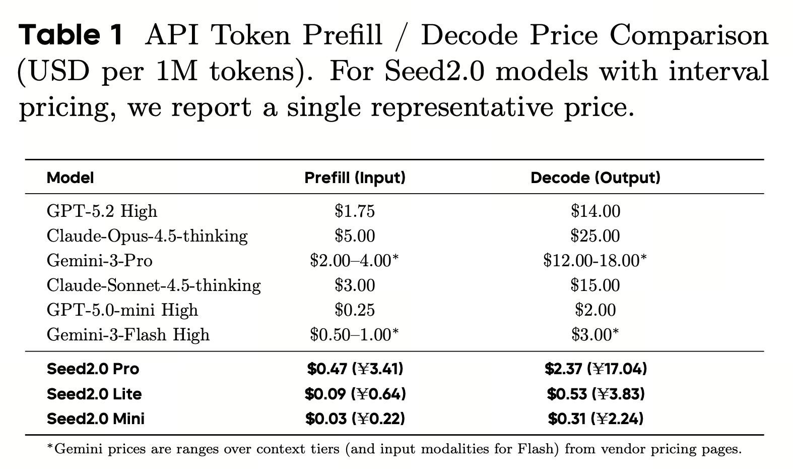 官方表示,Seed2.0 的一项核心优势体现在其成本结构上。字节对比了当前主流基础模型的 API 定价情况,从下图可以看到,在保持接近前沿模型性能水平的前提下,Seed2.0 的 Token 单价约低一个数量级。