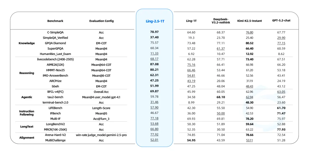 架构上的升级使得 Ring-2.5-1T 和 Ling-2.5-1T 在多个权威基准评测上均有不错的表现。Ling-2.5-1T 作为百灵家族当前最强大的即时模型,其与主流的大尺寸即时模型相比,在复杂推理、 指令遵循能力具有明显优势。