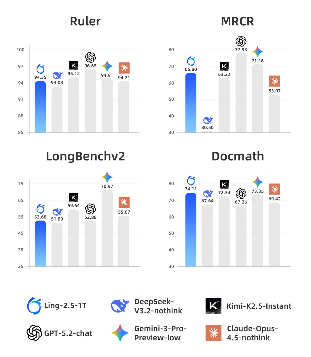 Ling-2.5-1T 还专门针对超长上下文场景进行了系统性评测。在与采用 MLA 和 DSA 架构的大型即时模型对比中,Ling-2.5-1T 在多项长文本任务中表现出一定优势,验证了混合注意力路径在工程落地中的可行性。不过,与当前领先的闭源模型,如 GPT-5.2、Gemini 3 Pro 相比,仍存在一定差距。百灵团队表示,仍将持续在接下来版本中推进相关能力的进一步提升。