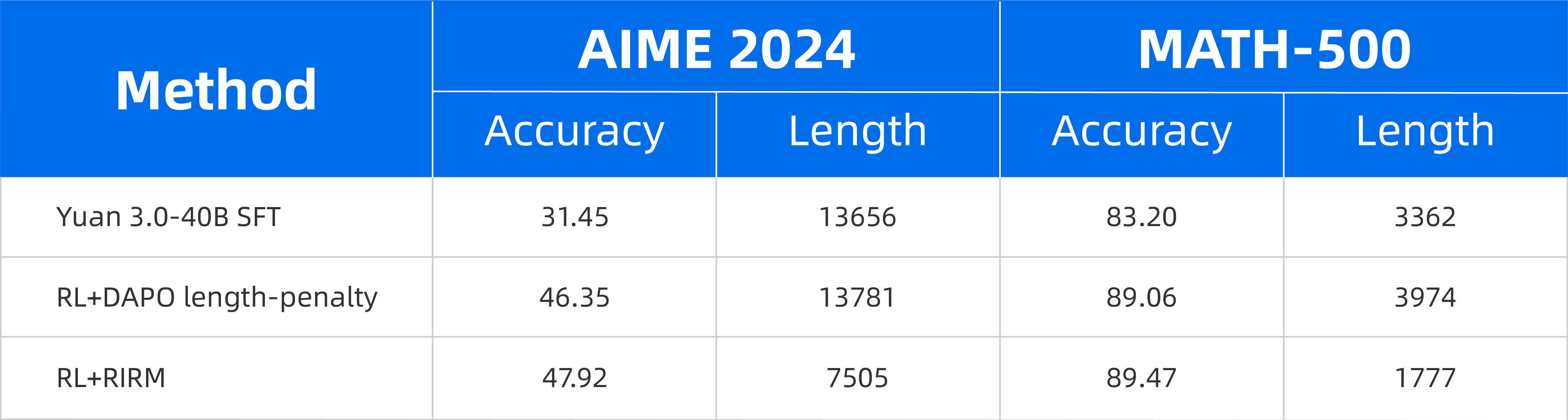 表 1:Yuan3.0 Flash 采用 RIRM 的强化学习训练与 DAPO+长度惩罚的精度与输出 token 数量对比