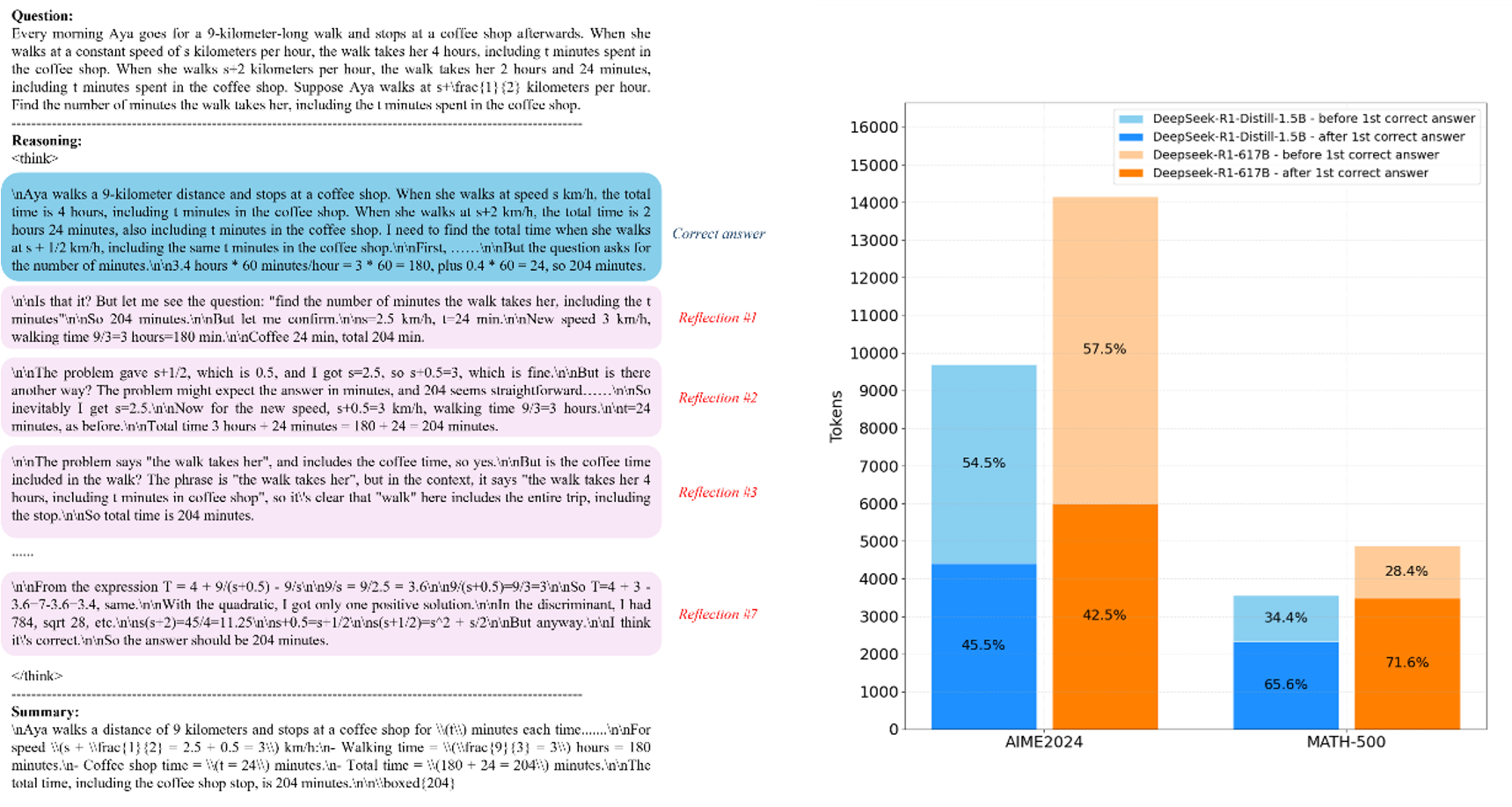 近年来,长思维链(Chain-of-Thought)成为提升大模型推理能力的主流范式,但在实际应用中也带来了新的问题:推理过程冗长、算力消耗大、部署成本高,甚至在得到正确答案后仍持续大量生成冗长的内容,(如图 3)。