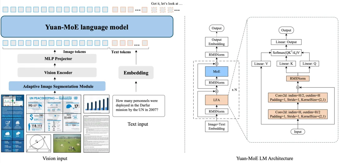 图 1:Yuan 3.0 整体架构和基于 MoE 的语言主干。左侧为 Yuan 3.0 架构,含三个组件:(1) ViT 编码器处理图像;(2)轻量级 MLP 投影器对齐视觉与文本特征;(3)基于 MoE 的语言模型。右侧为采用局部过滤注意力(LFA)的源 3.0 语言主干网络。