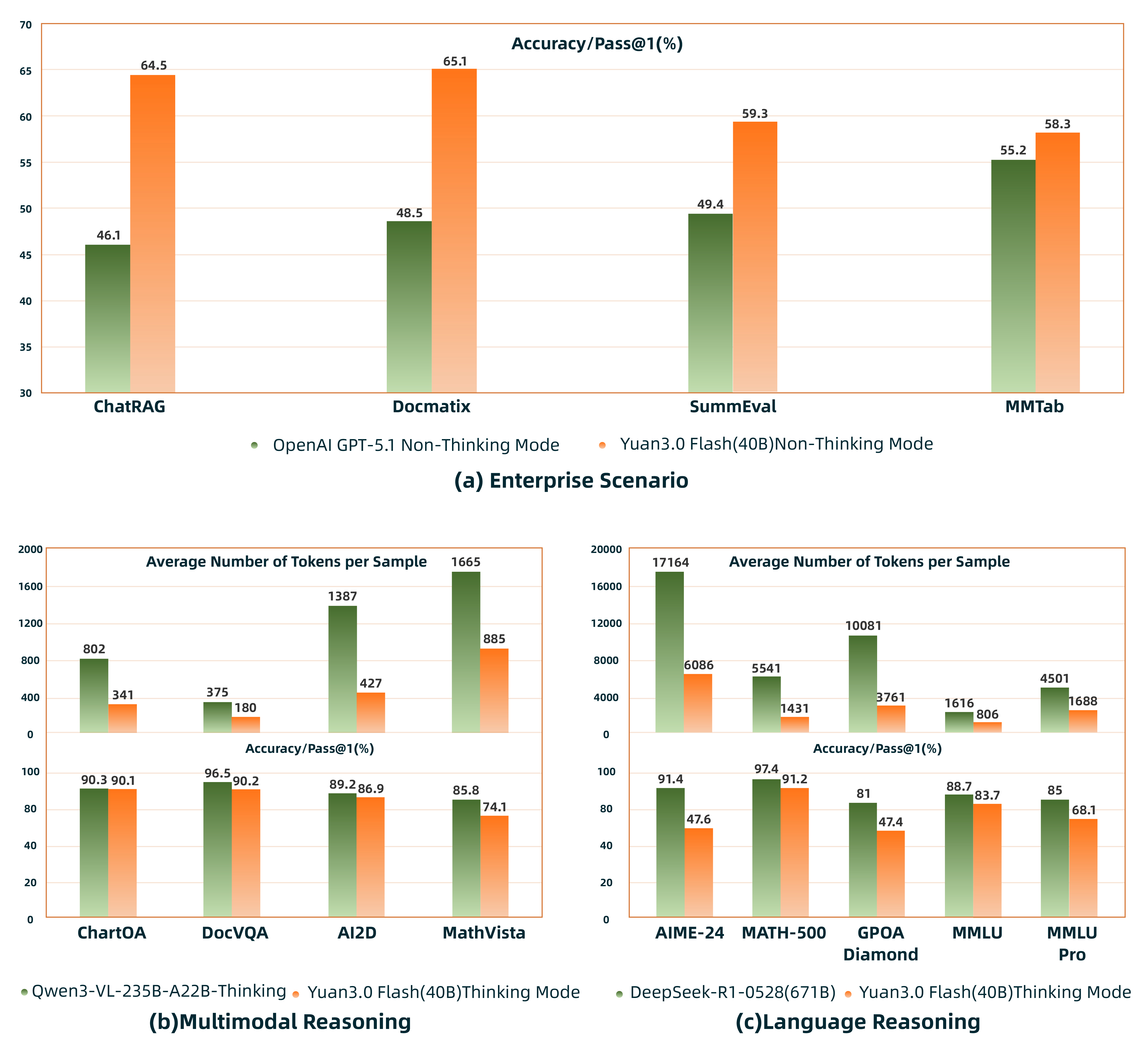 在大规模 MoE 模型上实现了更稳定的强化学习训练,训练效率提升 52.91% 。Yuan3.0 Flash 能够在默认推理模式下即可满足绝大多数企业场景需求,而无需额外开启“深度思考模式”,真正实现“默认即高效、即智能”。